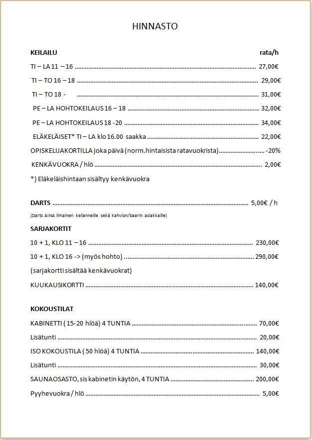 Hinnasto Pelihalli sulkeutuu puoli tuntia aiemmin ennen sulkemisaikaa. (Huom! Golfsimulaattori ei tällä hetkellä käytössä)